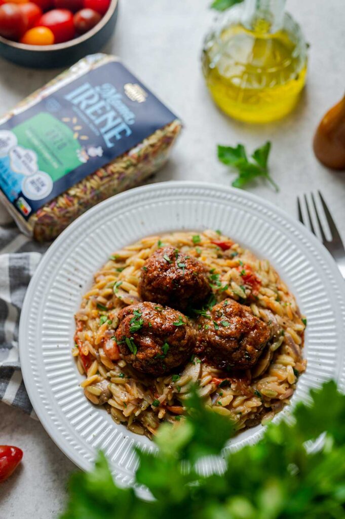 Spoon the creamy vegetable orzo onto plates. Top with the mini meatballs. Finish with fresh parsley and a drizzle of olive oil.