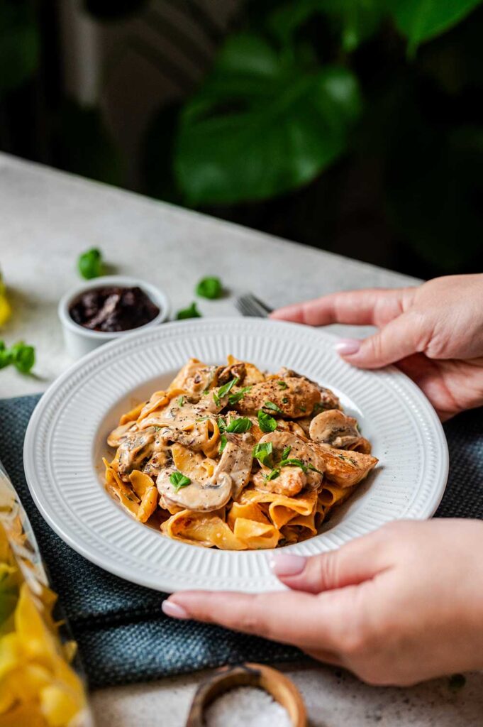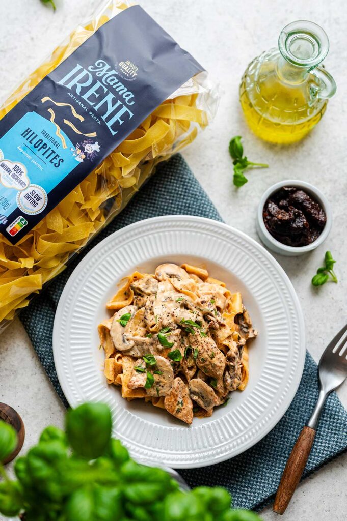 Mama Irene traditional hilopites combine perfect into a velvety sauce with tender chicken, sautéed mushrooms and flavorful sun-dried tomatoes. The cream and parmesan add richness and silky texture, while the sun-dried tomatoes bring that distinctive full-bodied, slightly sweet intensity that elevates the entire dish.