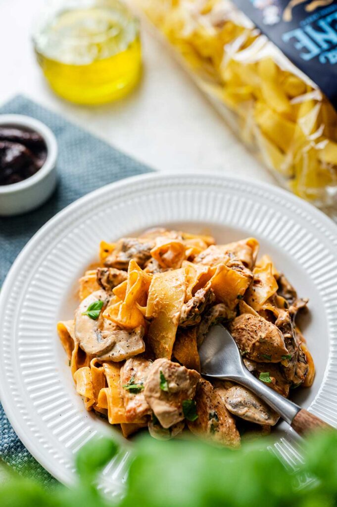 Reserve about ½ cup of pasta water, then drain the pasta. - Heat olive oil in a large pan over medium-high heat. Add the chicken strips, season with salt and pepper, and cook for 4–5 minutes until lightly golden and cooked through. Remove from the pan and set aside.